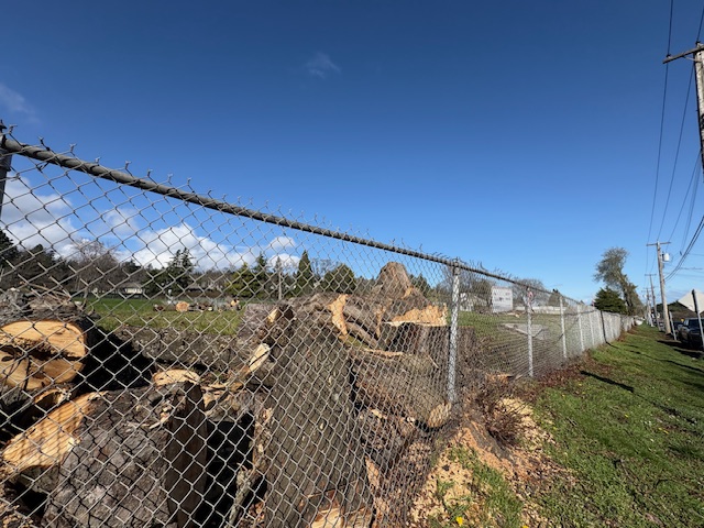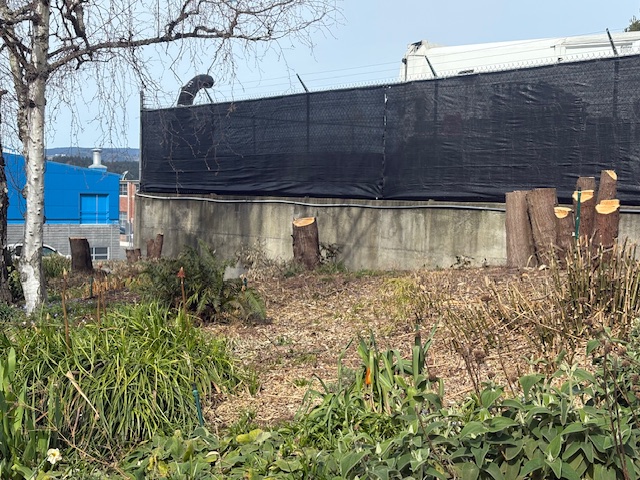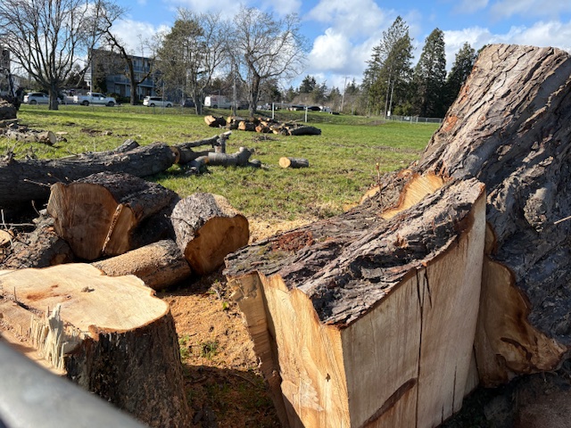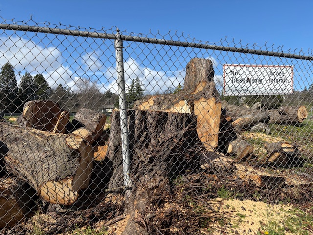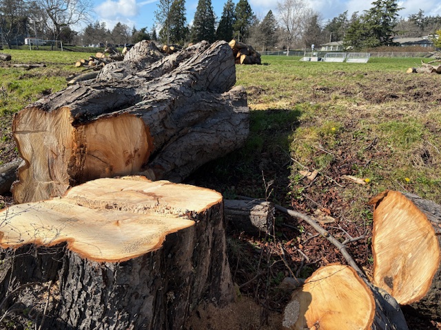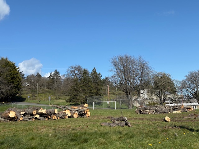 Numerous healthy, mature trees have recently been cut down along two boulevards on Colville Road, far from any possible site of development. And a few blocks away, a once treed and lush garden area in front of the Public Works Yard on Esquimalt Road, just before Canteen Road, was cut to the ground exposing the building, lights, noise and industry to those in apartment buildings and condos on the other side of the street.