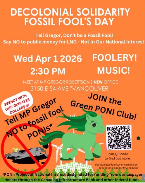 Join Decolonial Solidarity in MP Gregor Robertson’s riding for a day of “foolery and music” and to learn more about why LNG is not in our national interest. |