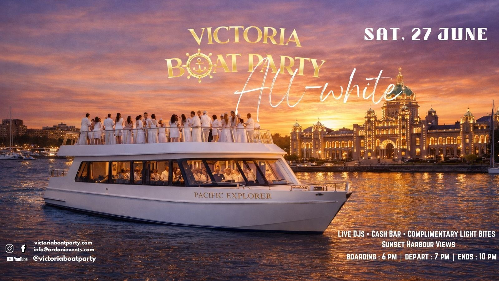 Join us on Saturday, June 27 for the All White Sunset Cruise, a premium evening on the water combining music, atmosphere, and unforgettable views of Victoria’s Inner Harbour.